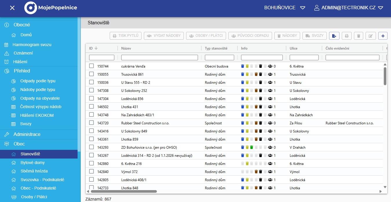 Zapomeňte na nepřehledné odpadové hospodářství nebo zbytečně časté svozy odpadu. S webovou aplikací MojePopelnice se tomu snadno vyhnete. Postará se o vše od evidence poplatníků, nádob, svezeného odpadu přes tvorbu nálepek a smluv k novým popelnicím až po generování podkladů pro přefakturaci nákladů ve svazku obcí.